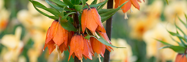 La couronne impériale rustique, grande cousine du petit méléagre œuf-de-vanneau (Fritillaria meleagris), est une variété appréciée des amateurs de jardinage. Outre le ‘Lutea’ (Lat. luteus = jaune), QFB Gardening offre également les variétés de couronnes impériales ‘Rubra’ (Lat. ruber = rouge) et ‘Aurora’ (rouge-orange).