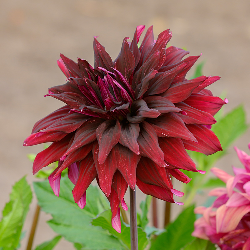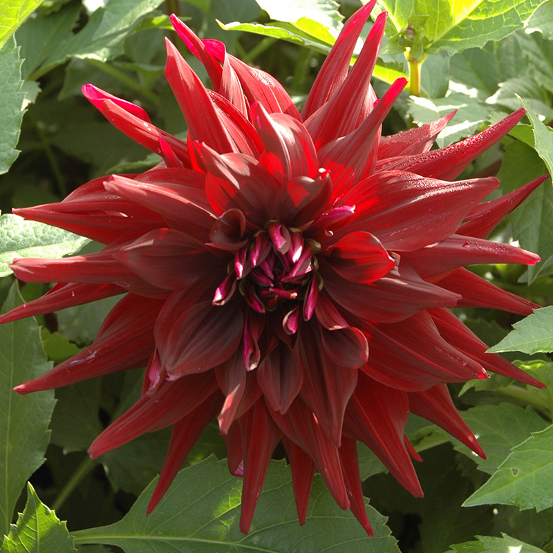 Le dahlia semi-cactus Brigitta Alida est un grand dahlia décoratif qui atteint une hauteur d'environ 100 cm. Les fleurs d'un rouge profond et velouté peuvent atteindre un diamètre de 22 cm et sont donc également appelées dahlia dinnerplate. Les fleurs rouges du dahlia poussent sur de grandes tiges robustes, ce qui les rend particulièrement bien adaptées à la partie arrière d'une plate-bande.