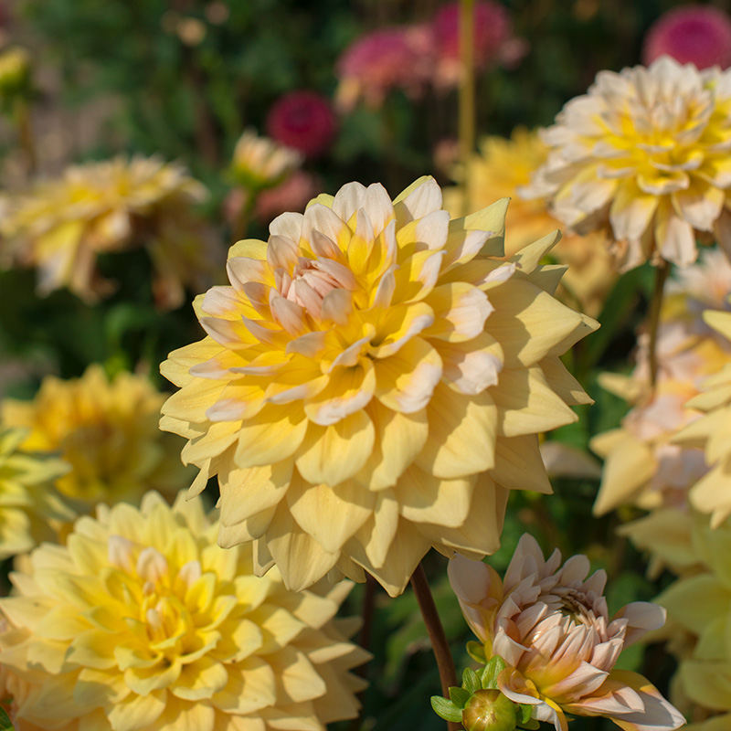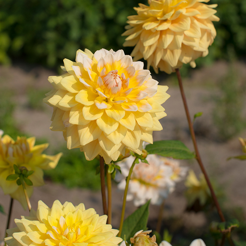 Le dahlia 'Seattle' à grandes fleurs se distingue par ses grandes fleurs jaune soleil et blanches et attire l'attention dans chaque plate-bande. Le dahlia décoratif 'Seattle' est un dahlia décoratif avec une forme de fleur presque parfaite. Le dégradé intéressant du jaune doré au blanc confère à ce dahlia son aspect unique. Cette variété atteint une hauteur d'environ 70-80 cm et pousse sur un pied solide. Cette plante à floraison estivale est particulièrement belle lorsqu'elle est plantée en groupe.