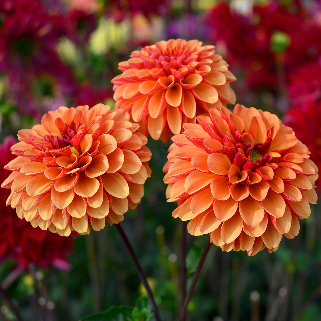 Deze Dahlia American Sunset is een schoonheid van een zomerbloeier die in elke tuin past. Een mooie kleine tot middelgrote Decoratieve dahlia, die prachtige donkere stelen heeft en donkere bladeren. Het contrast met haar stelen en bladeren staat voortreffelijk samen met haar lichtoranje, volle bloemen.