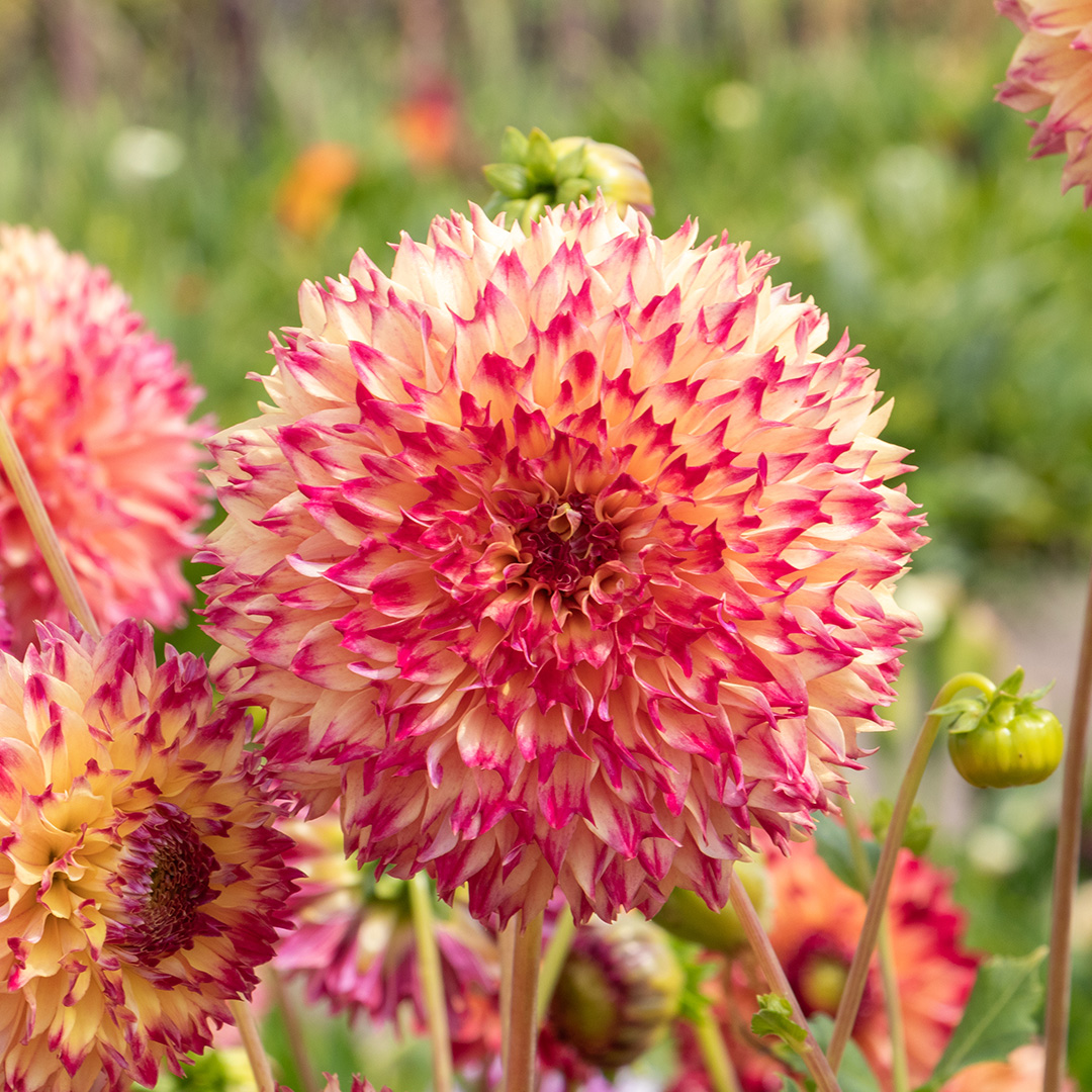 Le dahlia de Fimbriata "Aiyana" est une variété de dahlia enchanteresse aux fleurs chatoyantes d'un orange et d'un jaune éclatants. Le dégradé de couleurs particulier, du jaune à l'intérieur au rouge à l'extérieur, est très spécial. Ses pétales doubles uniques apparaissent comme de petits soleils qui brillent sous un ciel bleu. Cette variété fleurit abondamment et durablement et attirera l'attention dans chaque jardin jusqu'aux premières gelées. Donnez à votre espace extérieur une atmosphère chaleureuse et ensoleillée avec le dahlia "Aiyana".
