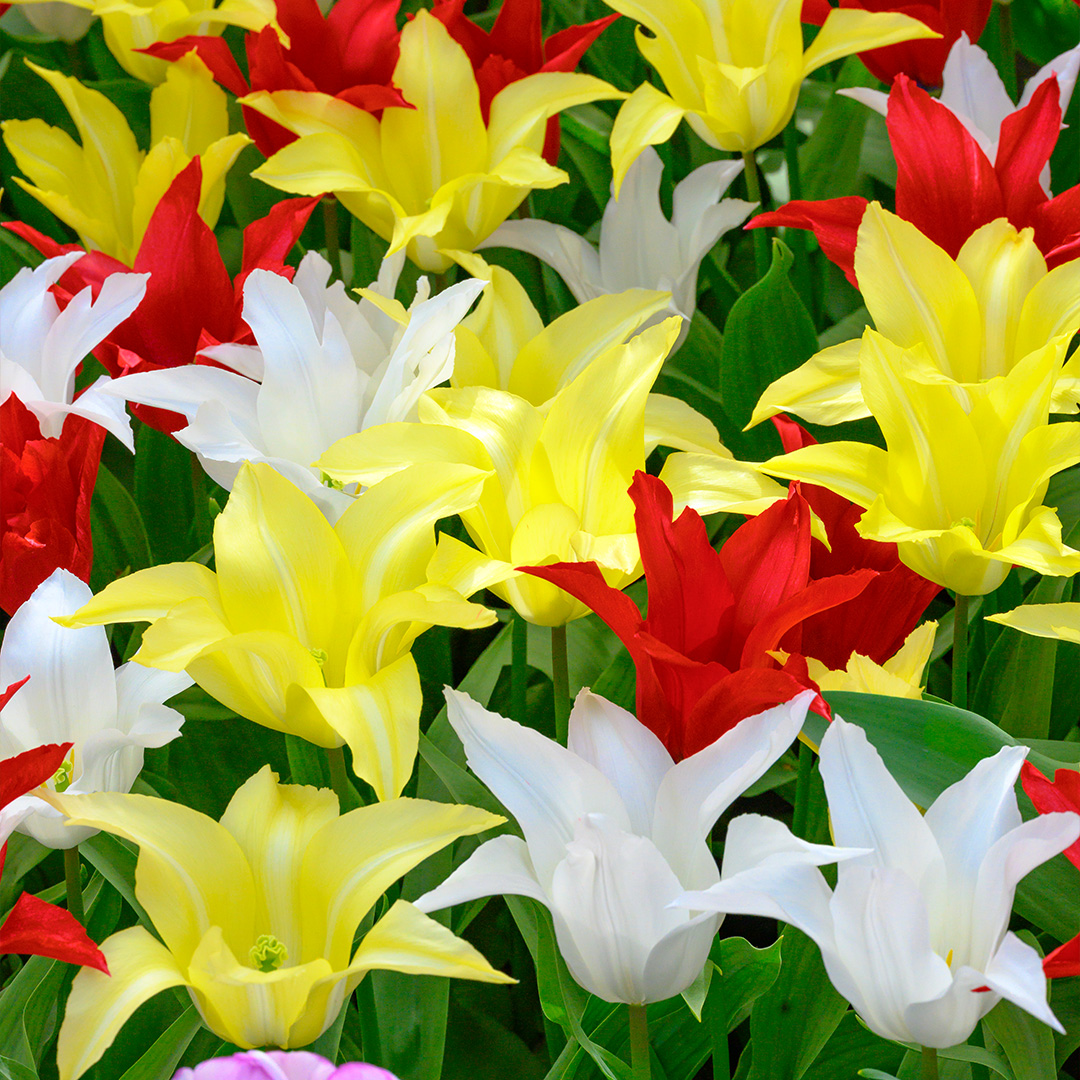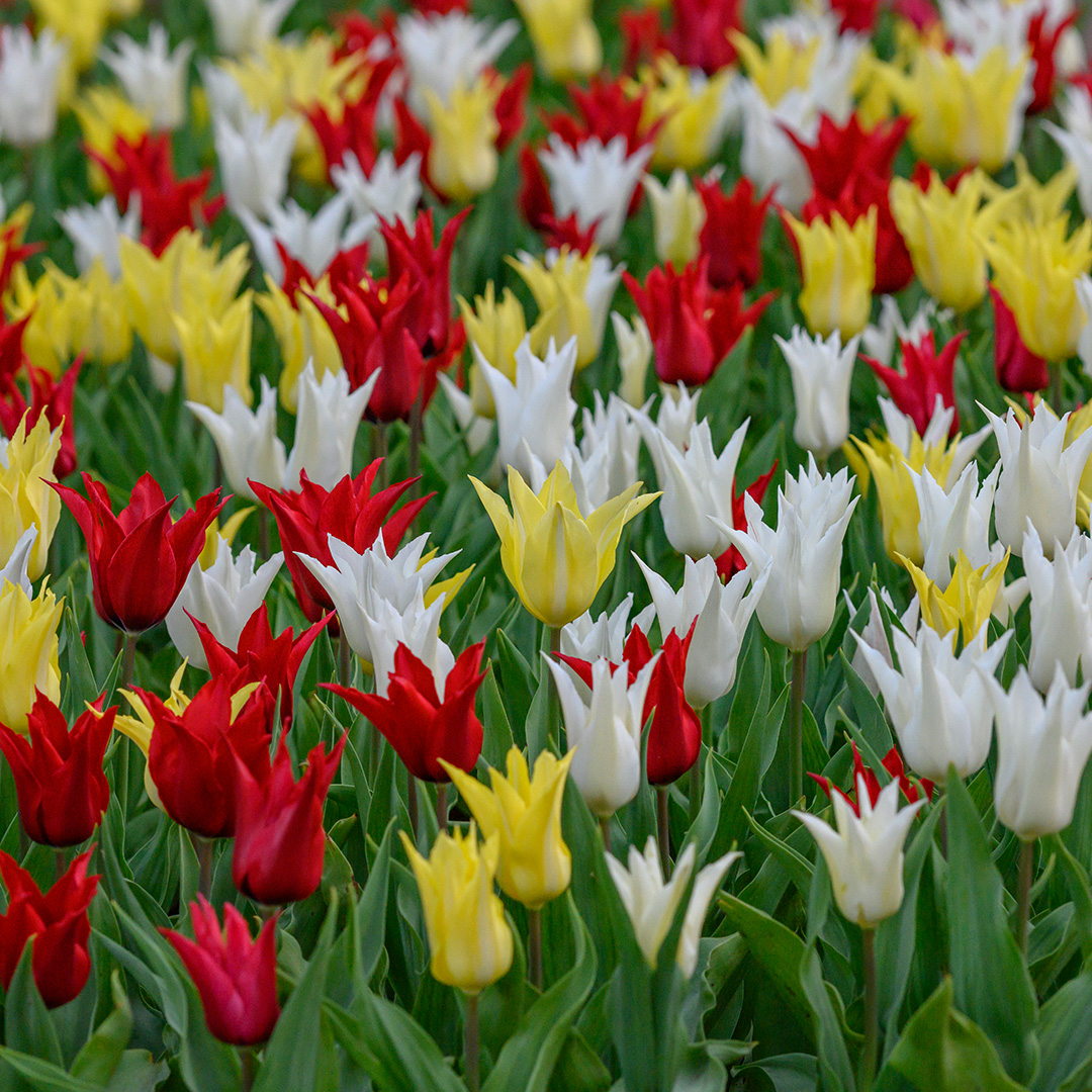 De basis van dit magnifieke mengsel zijn de gracieuze leliebloemige tulpen, een selectie van topvariëteiten die bekend staan om hun elegante, slanke bloembladen die zich sierlijk naar buiten buigen. 'Très Chic Festival' omvat specifiek de prachtige soorten 'Tres Chic', 'Florijn Chic' en 'Isaac Chic'. Samen creëren deze tulpen een verbluffend palet van verfijnde tinten van geel, rood en wit, die perfect harmoniëren en een gevoel van serene luxe uitstralen. Met een typische hoogte van 40-60 cm voegen ze een prachtige gelaagdheid toe aan uw border.