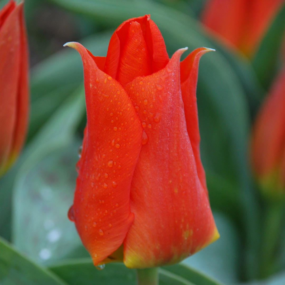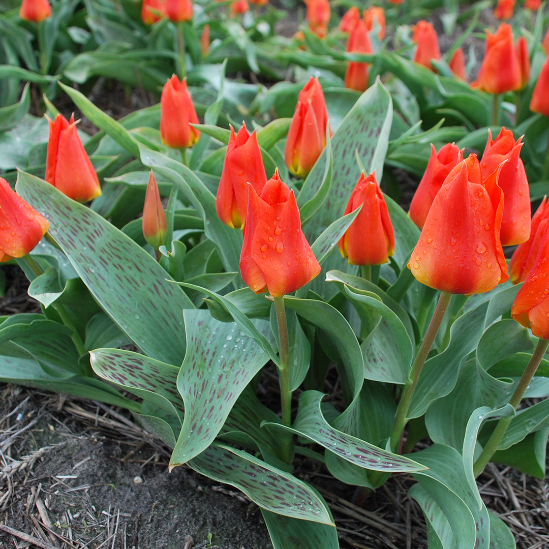 Miramare est une belle tulipe orange qui fleurit par tous les temps. La tulipe Miramare, qui pousse peu, est une variété charmante qui produit de grandes fleurs orange aux couleurs vives. Mesurant jusqu'à 30 cm de haut, la tulipe Miramare à l'odeur douce est idéale pour être plantée le long des chemins ou en groupe. Elle est également très belle en pot sur le balcon ou la terrasse. Les pétales pointus formant des bourgeons exceptionnellement grands s'ouvrent largement par temps ensoleillé et restent fermés en forme de goutte d'eau par temps nuageux. La belle tulipe Miramare ravit non seulement par ses fleurs, mais aussi par ses feuilles. Ces feuilles grisâtres, larges et ondulées, sont ornées de marques pourpres disposées de manière complexe. Cela rend cette plante très gracieuse, non seulement pendant la période de floraison.