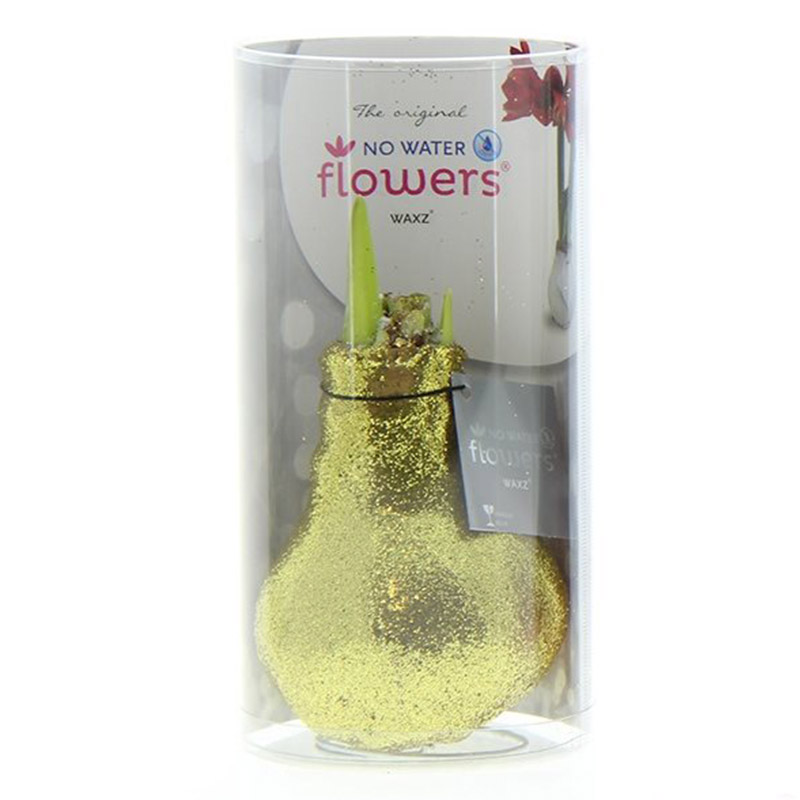 Cette Amaryllis Wax Glitterz Gold en tube est préparée pour recevoir une couche de cire et n'a donc pas besoin d'eau, tout en ayant suffisamment d'énergie pour que les fleurs sortent. Les beaux jours reviennent, surprenez quelqu'un en lui offrant ce magnifique tube rempli d'or de la fleur exotique Amaryllis, et vous entendrez plus tard quelle surprise ce fut. La série Glitterz Wax Amaryllis est finie avec des paillettes dites "Ecoglit®". Il s'agit de particules de paillettes écologiques et compostables qui donnent l'effet de paillettes fantastique bien connu.